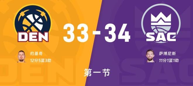威少来到场上突分阿丘瓦三分打铁,约基奇中距离抛投轻松打中,拉文三分抬手命中,约基奇又内线轻松抛中,穆雷三分续上火力比分迅速来到了24-15,国王再喊暂停。比赛继续小萨利用节奏造成约基奇犯规两罚一中,面对约基奇小萨的表现欲望很强,约翰逊走步失误威少助攻小萨抛投还有已经得到了11分,小哈达威三分不中威少中距离试试同样不中,约基奇篮下补篮命中,小萨篮板球出界掘金继续进攻布劳恩三分打铁,蒙克来到油漆区笑纳2分,比赛进入首节最后三分钟,尤班克斯吃饼暴扣,蒙克三分飚中国王将比分追到25-28仅落后3分,掘金喊出暂停。回到比赛哈达威三分止血,威少漂移上篮也有,克利福德、蒙克连续三分国王33-31反超,布朗自己突破又失误,最后一个回合尤班克斯吃饼被犯规两罚一中,掘金最后一攻穆雷中距离命中,首节打完掘金33-34落后1分!