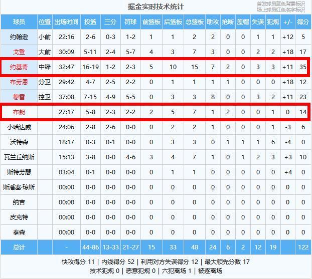 三号功臣(布朗):8中5得14分7篮板1助攻2抢断,进攻稳定防守强悍,这就是掘金签回他的原因!